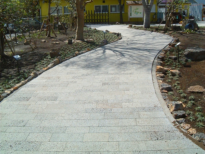 | 夏でも熱くならない石張り舗装(コーラルストーン) | グレー御影石ピンコロ床 | 桜御影石ベンチ |