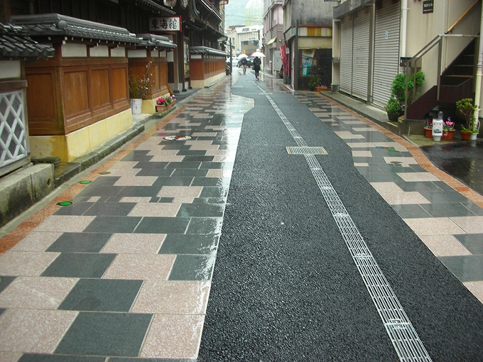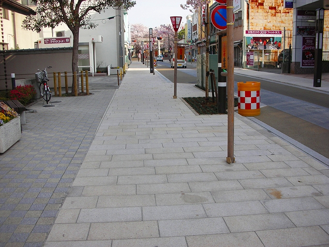 | 桜御影石、グレー御影石歩道 | 赤御影石道標 | 黒御影石、グレー御影石歩道 |